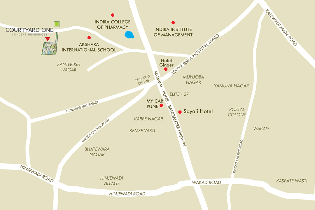Courtyard One is strategically located next to the Rajiv Gandhi Infotech Park, Hinjewadi on the Mumbai Bangalore Bypass. The Expressway is just 1 km away, and so are the 3 proposed BRT routes, namely Nashik Phata-Wakad, Aundh-Ravet and Kalewadi Phata-Dehu Alandi Road. So the location guarantees class, convenience and connectivity for a superior lifestyle.